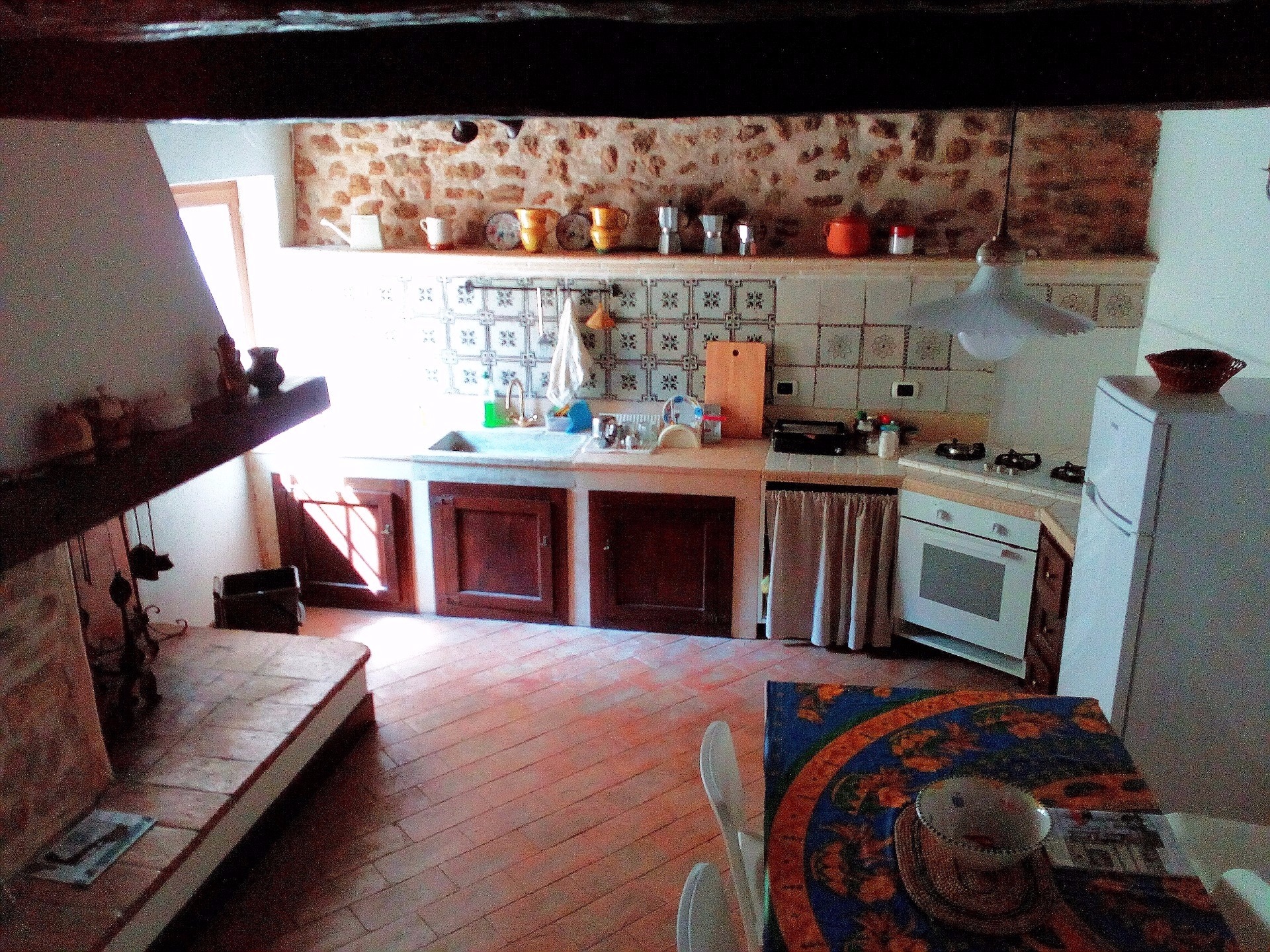 La grande cucina è fresca d'estate e calda in inverno grazie al camino e ai termosifoni.